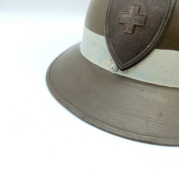 Original Belgian M31 Adrian helmet, used by the Belgian Red Cross, complete with its original copper insignia and paint. Aside from the missing drawstring in the liner, the helmet is in beautiful used condition and remains in good overall shape.