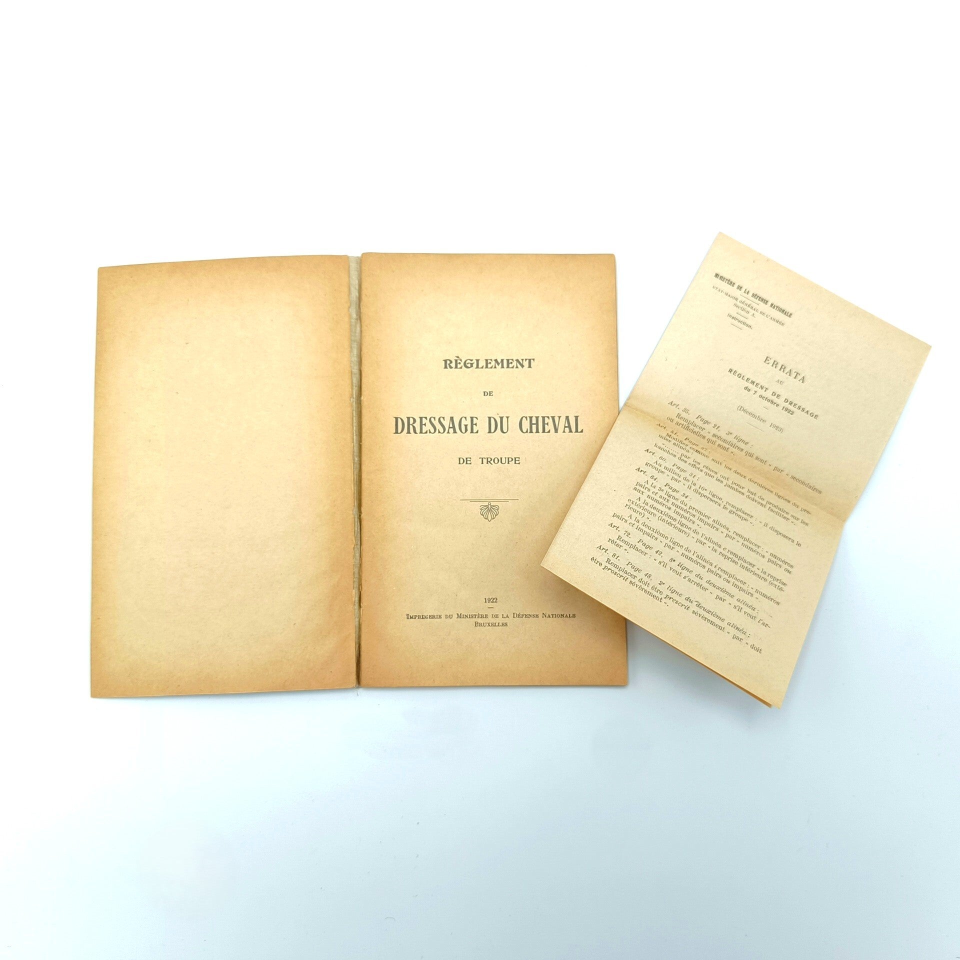 Original Belgian manual on Dressage du Cheval, published in 1922. A small booklet containing various instructions and an additional insert.