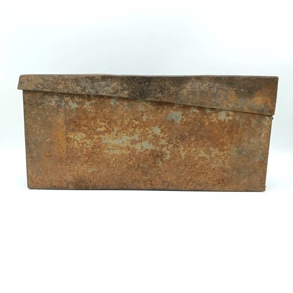 Original German WWI metal MG08 ammunition case. The case remains in untouched original condition. Some of the original paint is still present, and all parts are functional, although there is surface rust throughout.