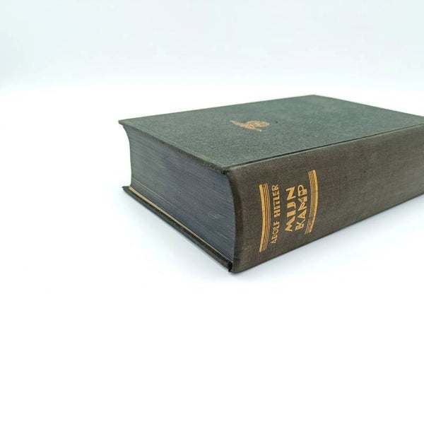 Original fourth printing of the Dutch edition of Mein Kampf by Adolf Hitler, printed in Amsterdam. The book is generally in good condition. The spine remains intact, with some staining on the cover and pages. The spine is slightly faded, and there is a small tear on the front cover.